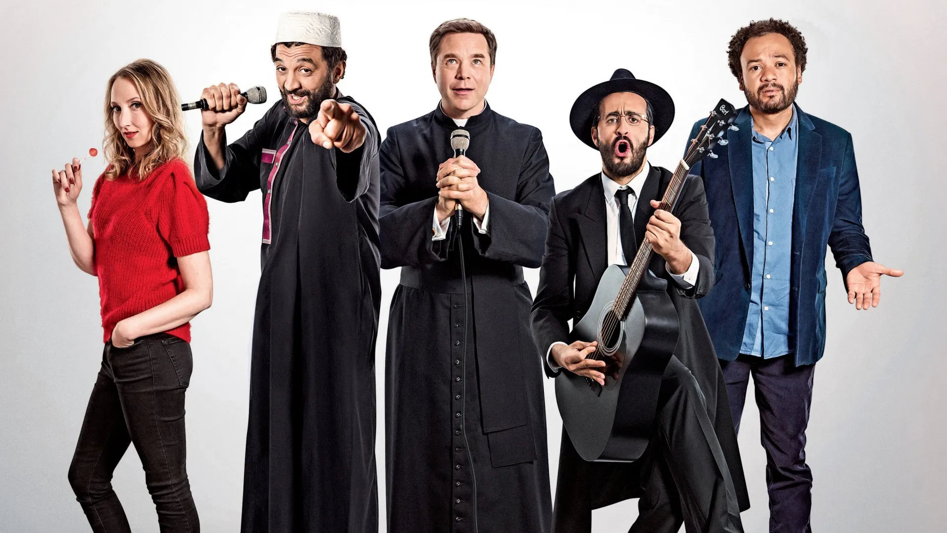 To keep his job, a music producer forms a band with a priest, a depressed rabbi and a fake imam